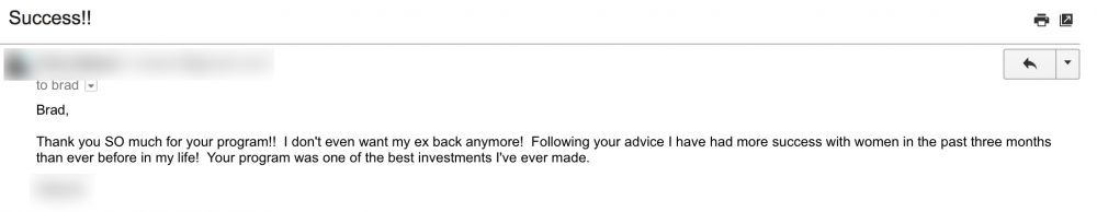 Brad is author of three best-selling online programs: The Ex Factor, which teaches readers how to get their ex back, Mend the Marriage, which helps readers to revive a dying marriage, and Beat The Breakup, a guide to getting over your ex overnight. He also offers personal coaching to a limited number of clients, guiding them through the process of winning back an ex or rescuing a marriage from the brink of collapse.
